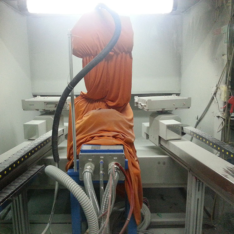 產(chǎn)品隨流水線輸送,可吊掛,可地軌線,產(chǎn)品到達粉房后,機器人啟動,在線跟隨產(chǎn)品噴涂,這樣效率很高,粉末可以采用大旋風回收